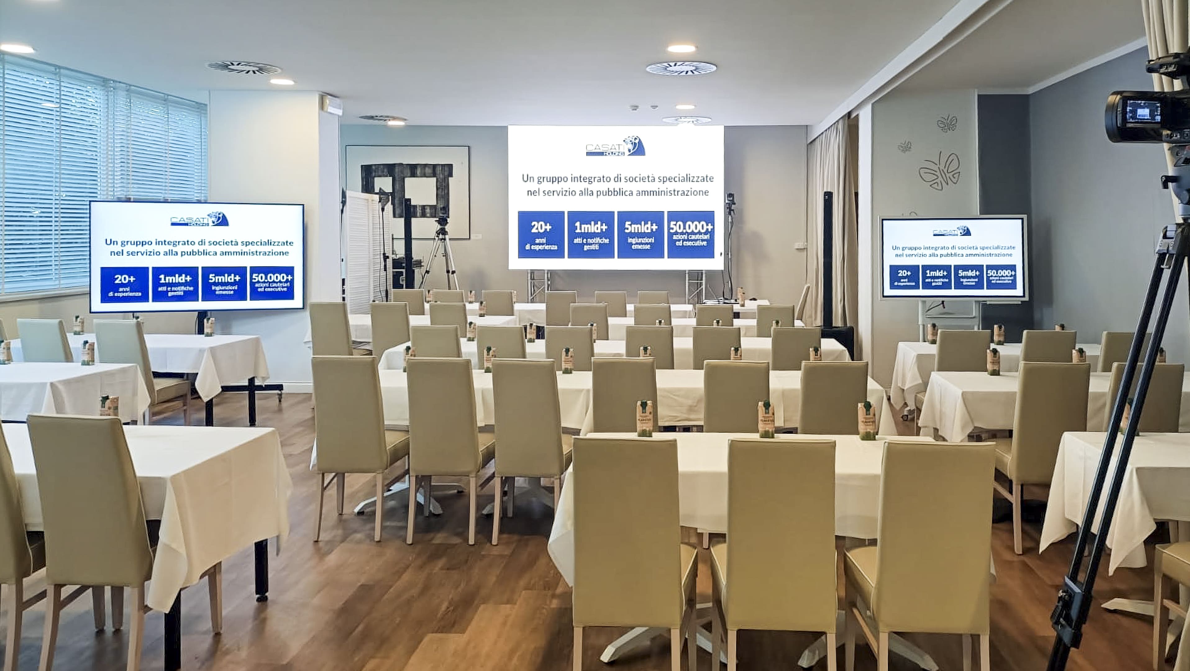 Entrambe le sale sono dotate di attrezzature audiovisive all’avanguardia, lavagna a fogli mobili, kit congressista e possibilità di personalizzare la grafica con il logo aziendale. La flessibilità degli spazi consente di adattare la disposizione delle sale e creare aree espositive dedicate.